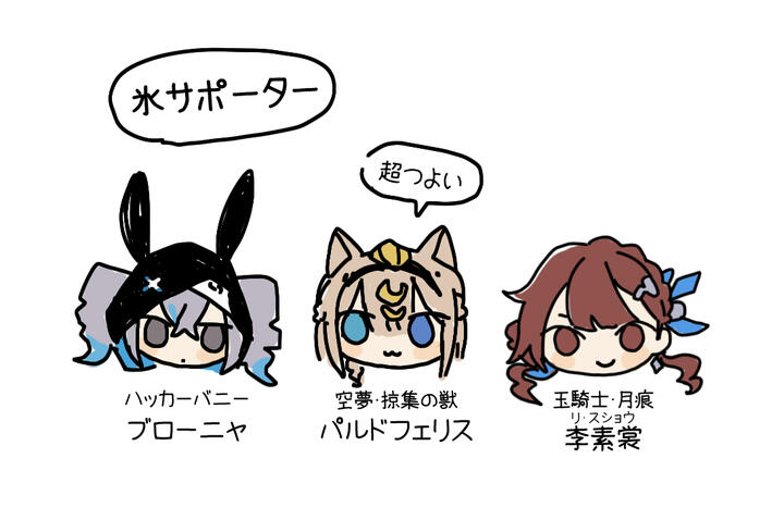 サポーターの装備は基本後回しでもいいのですが、フェリスに関してはめちゃくちゃ強いのでモチーフ装備がPUされていたら絶対に回した方が良いですハッカーバニー ブローニャは追撃メインの氷サポーターです
