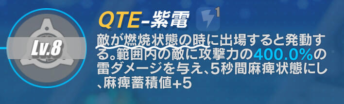 例えば『敵が燃焼状態のときに出場すると発動する』という文から始まっているこのQTEの場合、燃焼を付与できる別のキャラが必要