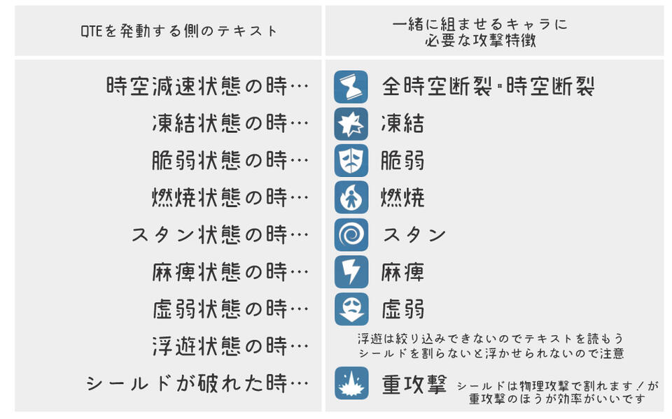 QTEの条件とそれに合った攻撃特徴をまとめたので、良ければ参考にしてみてください