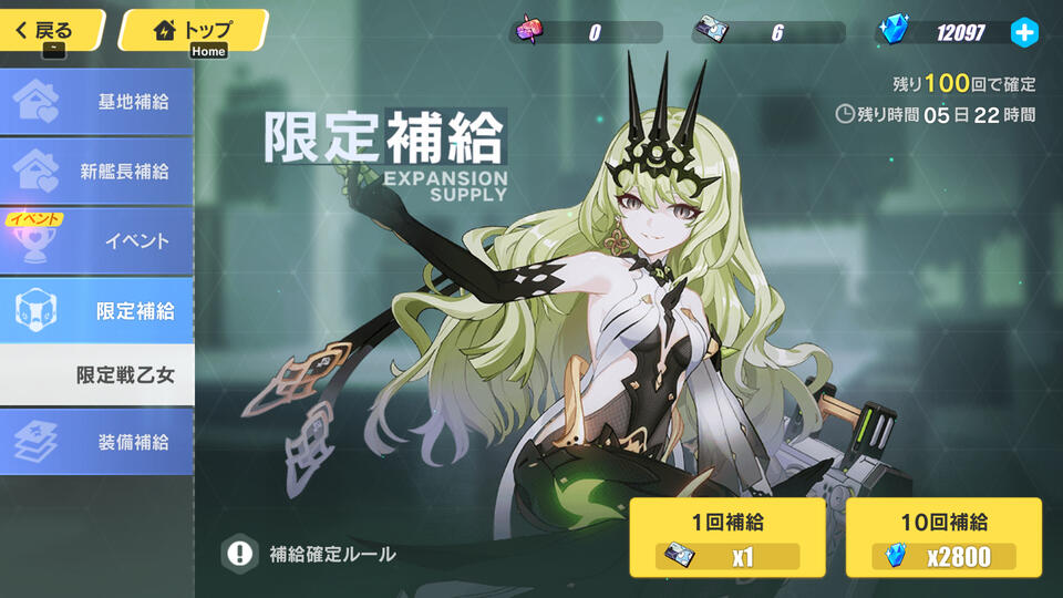 天井は限定補給と共有しているので、もし引けなかったとしても大丈夫です艦長レベル50以上だと、同時にそのキャラに合う人形補給も開催しています