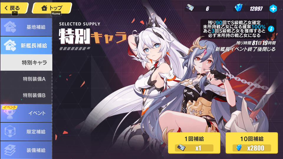 限定補給では、バージョンアップで追加された新キャラや、基地補給(恒常ガチャ)に入っていないキャラが復刻でピックアップ(PU)されています